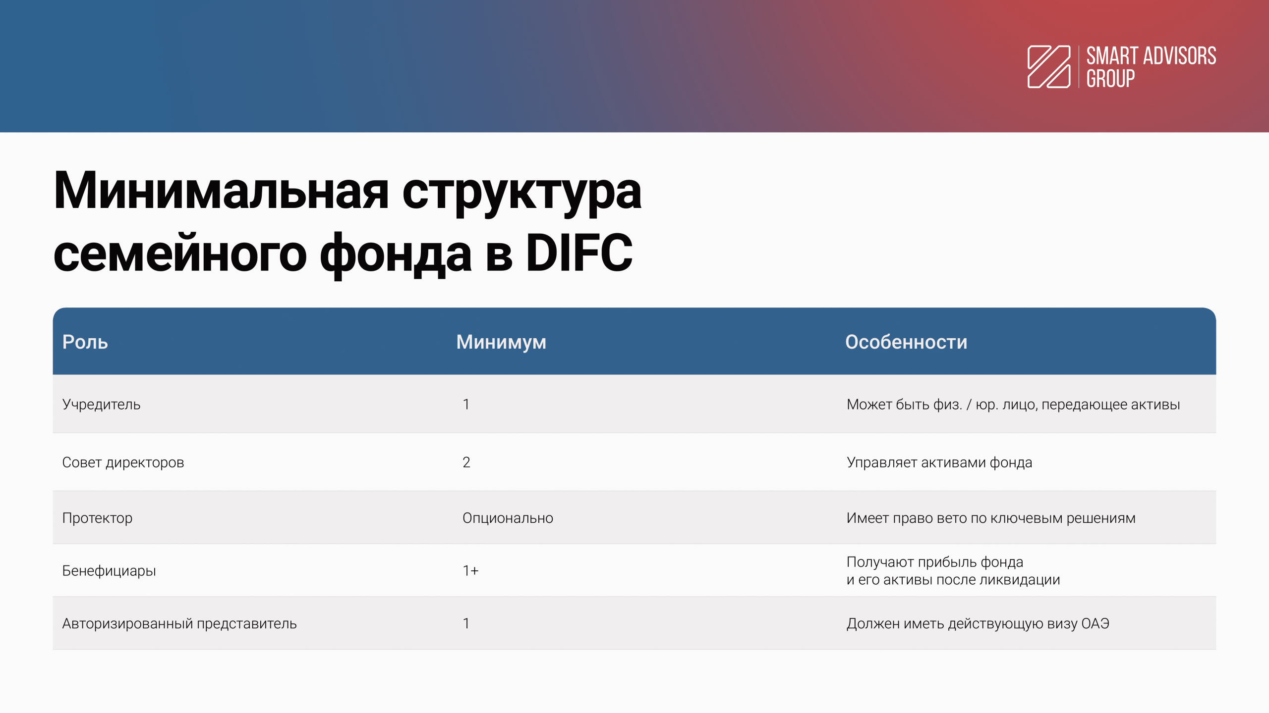 DIFC, крупнейший финансовый центр ОАЭ, позволяет регистрировать фонды для управления семейными активами. Фонды не только отвечают запросам о конфиденциальности, но и позволяют получить доступ к развитой банковской и финансовой инфраструктуре DIFC.